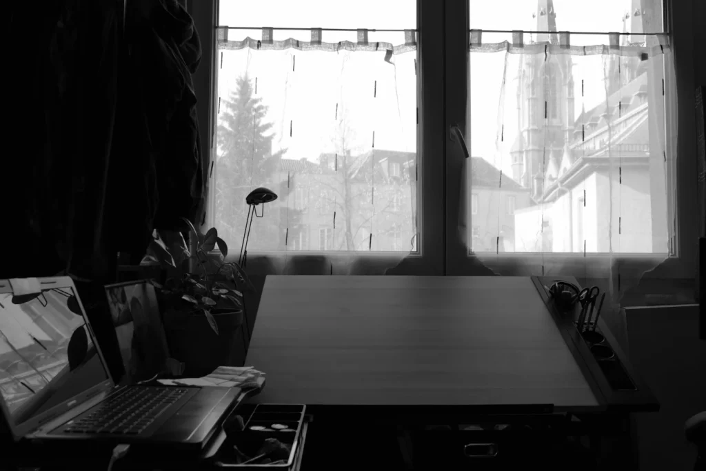 ~ vivre au rythme des caprices de la lumière des heures du jour qui décline, du temps dehors, des saisons qui défilent, devant l’unique fenêtre – les yeux qui piquent, brûlent, s’abîment toujours plus, la vue qui baisse, se brouille, les verres des lunettes à réajuster régulièrement ;